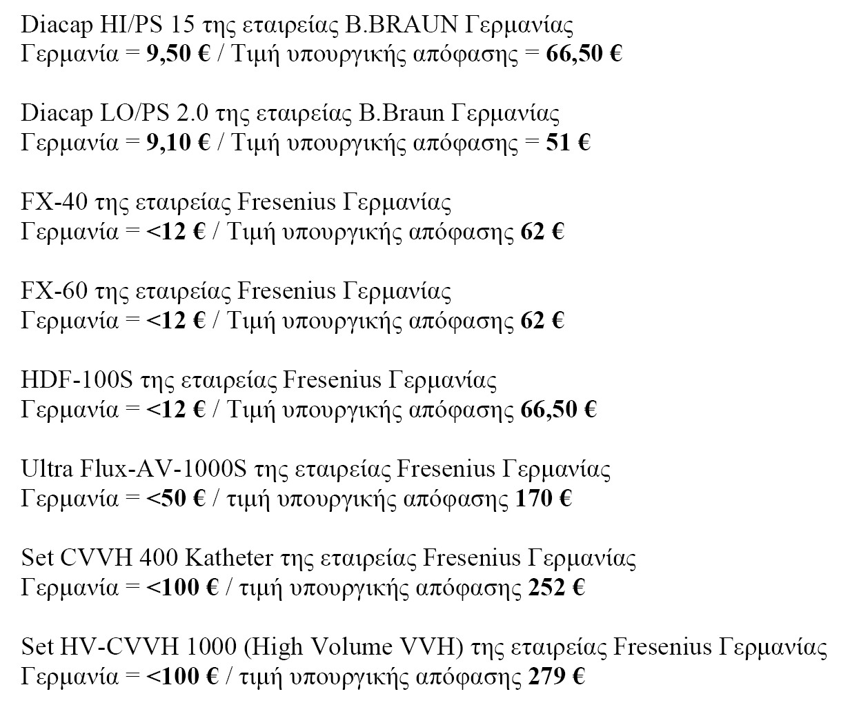 Με την άποψη αυτή φαίνεται να συμφώνησε απόλυτα και ο υπουργός Παπακωνσταντίνου. Ο οποίος, προς χάριν του δημοσίου συμφέροντος ασφαλώς, "έκοψε" τα ομόλογα που λέγαμε και στην προηγούμενη ανάρτηση, χωρίς πολλές και περιττές ερωτήσεις και πλήρωσε την Johnson & Johnson. Και μαζί της και όλο το υπόλοιπο σκυλολόι, που γινόταν τόσα χρόνια θυσία για να εξυπηρετήσει το ελληνικό κράτος για λίγα ψίχουλα. Μόλις 800% ψίχουλα. Ας πούμε πλήρωσε τους μεταπράτες με τα φίλτρα αιμοκάθαρσης. Θέλετε τις δικές τους τιμές σε σχέση με αυτές που πληρώνουν τα γερμανικά νοσοκομεία; Να μερικές, έτσι πρόχειρα. Τις έχουν και οι υπουργοί. Τους ενημέρωσα.